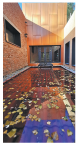 The property's design is energy-efficient, and most of the interior decorations are made from recycled materials. The water courtyard forms a small reservoir to collect and filter rainwater, with the base paved with tiles from older properties.