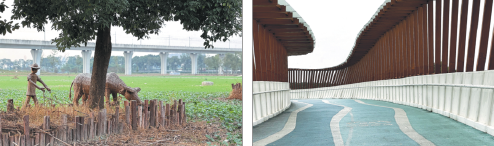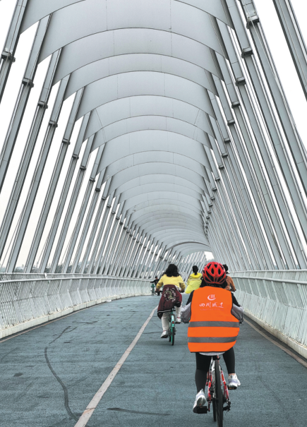 On the greenway, the most prominent features are the creatively designed and colorful bridges. They catch your attention not just because they offer riders challenging ascents and thrilling descents, but also because they span roads, fields and flower meadows, allowing riders to overlook the juncture between the city and its outskirts. From these bridges, you can witness the bustling traffic on the expressway on one side, and a rural tableau of suburban farmers tending to their fields on the other.
