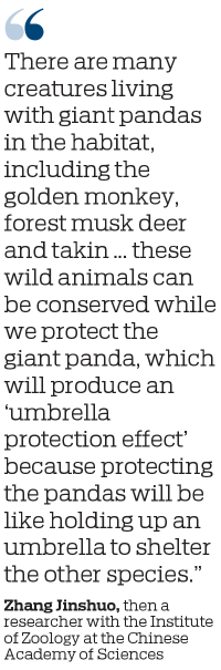 "There are many creatures living with giant pandas in the habitat, including the golden monkey, forest musk deer and takin … these wild animals can be conserved while we protect the giant panda, which will produce an 'umbrella protection effect' because protecting the pandas will be like holding up an umbrella to shelter the other species," he said.