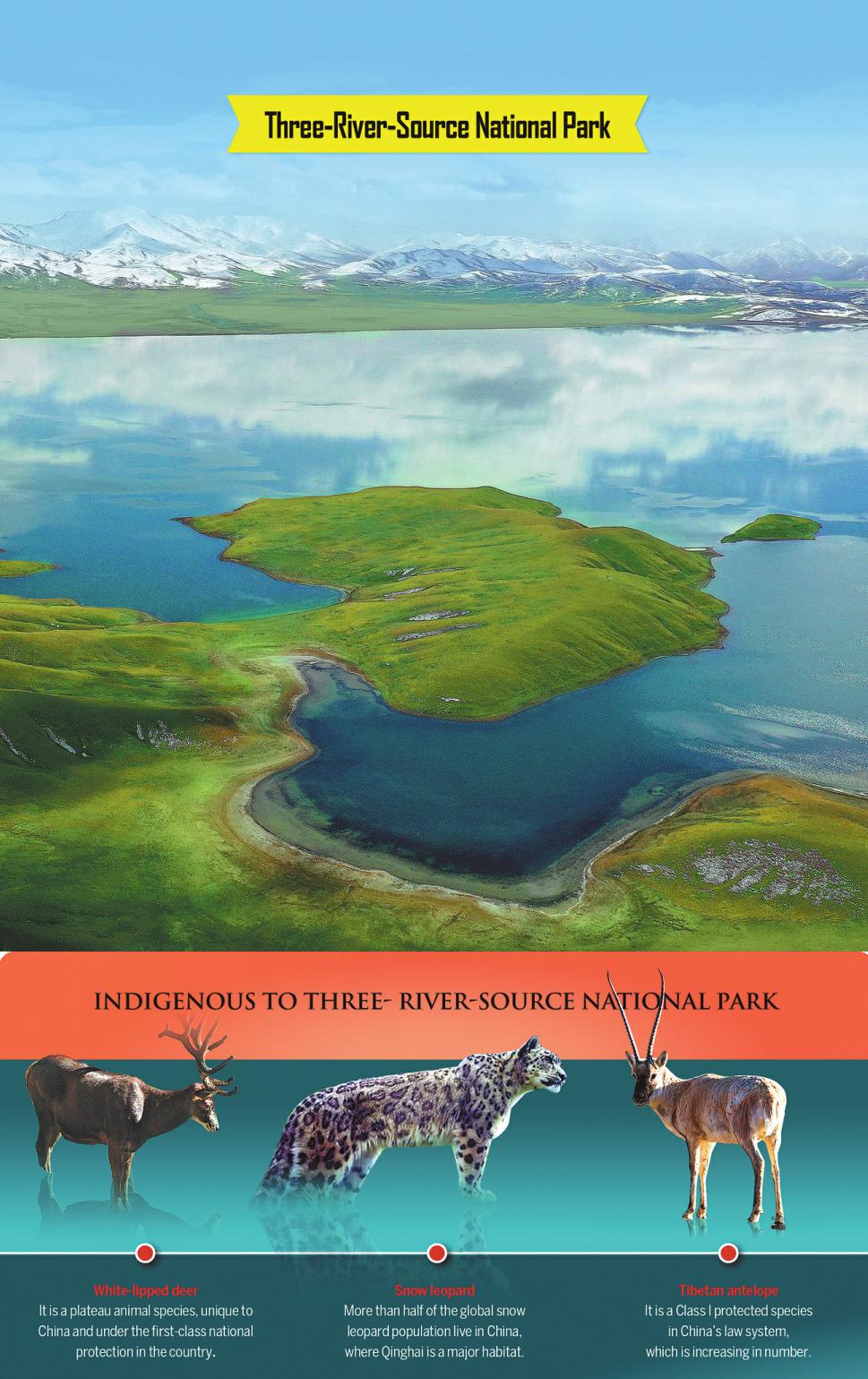 Standing at an average altitude of more than 4,700 meters, the sparsely populated park in Qinghai province is the ideal habitat for many wildlife species, including Tibetan antelopes and snow leopards.