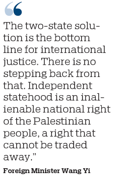"The two-state solution is the bottom line for international justice. There is no stepping back from that. Independent statehood is an inalienable national right of the Palestinian people, a right that cannot be traded away," Wang said.