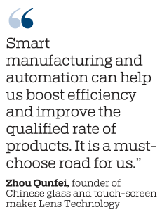 Zhou Qunfei, founder of Chinese glass and touch-screen maker Lens Technology, said: "Smart manufacturing and automation can help us boost efficiency and improve the qualified rate of products. It is a must-choose road for us."