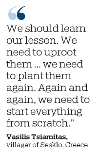 "We should learn our lesson," Tsiamitas said, looking at stumps of burned almond trees. "We need to uproot them... we need to plant them again. Again and again, we need to start everything from scratch."
