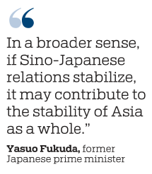 During the exchange meeting, former Japanese prime minister Yasuo Fukuda said: "In a broader sense, if Sino-Japanese relations stabilize, it may contribute to the stability of Asia as a whole … This treaty, in that sense, is for the entire world, and we need to manage it with a sense of responsibility."