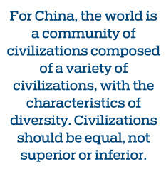 For China, the world is a community composed of a variety of civilizations, with the characteristics of diversity. Civilizations should be equal, not superior or inferior. The differences between civilizations need to be resolved through dialogue rather than conflict.