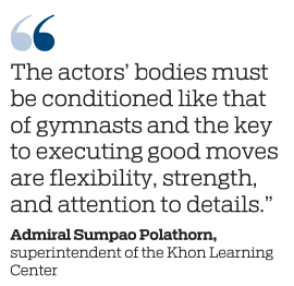 He explained that the four character groups have unique art expression for different emotions. "An audience who is well-versed in reading Khon gestures can tell what the characters are saying even without having to hear the dialogues," he added.