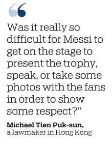 Messi's remarks drew the wrath of lawmaker Michael Tien Puk-sun, who called it a great insult since Messi made his explanation in Tokyo rather than when he was in Hong Kong.
