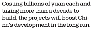 The increasing investments in water conservancy projects have also helped China to build three water diversion projects that channel water from water-rich South China to drought-prone North China. Two of the projects have been completed, and the third is under construction. Costing billions of yuan each and taking more than a decade to build, the projects will boost China's development in the long run.