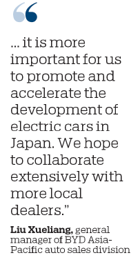 "Apart from bringing BYD's technology and products to Japan, it is more important for us to promote and accelerate the development of electric cars in Japan. We hope to collaborate extensively with more local dealers," Liu said.