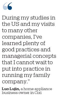 In 2017, after finishing his studies in the US, Luo Lujin embarked on the journey of taking over the home appliance company his father founded in Cixi. "During my studies in the US and my visits to many other companies, I've learned plenty of good practices and managerial concepts that I cannot wait to put into practice in running my family company," said Luo, 30.