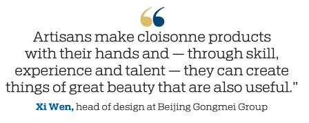 Xi worked as a designer with the Beijing Gongmei Group for years before she was transferred to the arts-and-crafts factory in 2016. Since then, she has concentrated on learning cloisonne techniques and designing related products as Zhang's apprentice.