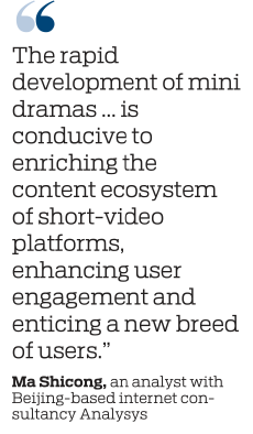"The rapid development of mini dramas, which are grouped into various genres including suspense, mystery and romance, is conducive to enriching the content ecosystem of short-video platforms, enhancing user engagement and enticing a new breed of users," Ma said.