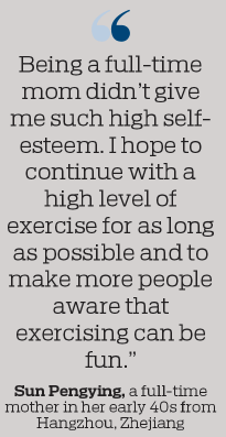 "Being a full-time mom didn't give me such high self-esteem. I hope to continue with a high level of exercise for as long as possible and to make more people aware that exercising can be fun," Sun added.