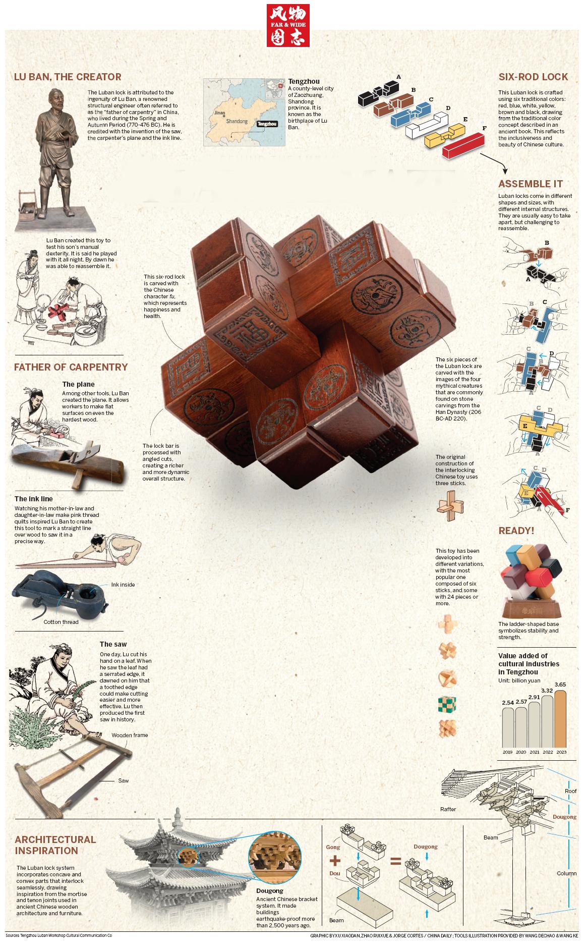 Recognized as the birthplace of Lu Ban craftsmanship, Tengzhou is widely known for its locks. It is now one of the key areas of China in which the intangible cultural heritage of Luban lock-making is maintained. Old carpenters in the city once considered the creation of a perfect Luban lock to be the standard for apprenticeship.