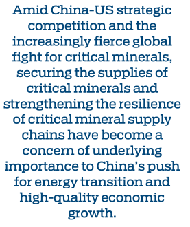 Amid China-US strategic competition and the increasingly fierce global fight for critical minerals, securing the supplies of critical minerals and strengthening the resilience of critical mineral supply chains have become a concern of underlying importance to China's push for energy transition and high-quality economic growth.