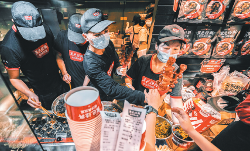 At Huangxing South Road pedestrian street, a bustling commercial section of Changsha's Tianxin district, 19-year-old Luo Cuiti bought a bowl of stinky tofu from a Hey Hey Black shop recently.