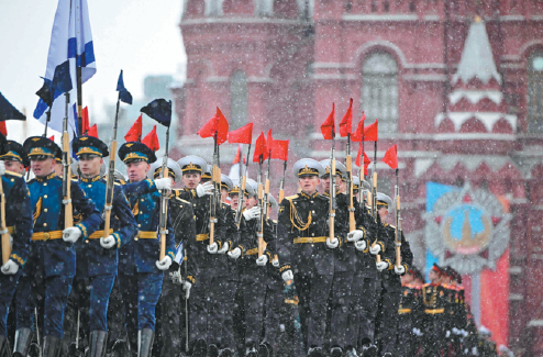 The parade marks the Soviet Union's defeat of Nazi Germany in World War II. The Soviet Union lost 27 million people in the war, and eventually pushed Nazi forces back to Berlin. Later, the red Soviet Victory Banner was raised over the Reichstag, or German parliament, in 1945.
