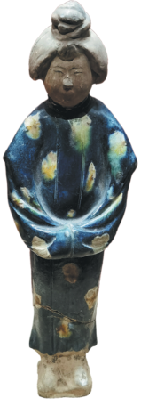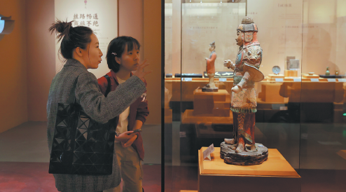 Another exhibit from the mausoleum, a blue-glazed pottery figurine of a standing woman, also reveals elegance and a sense of nobility, while the rarely seen color of the time indicates cross-cultural influences, as the ingredients for the dye may well have been brought to China along the Silk Road, Feng says.