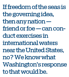 Such an argument seems inconsistent with the US wanting to affirm its role as the champion of peace and prosperity around the world. More importantly, if freedom of the seas is the governing idea, then any nation — friend or foe — can conduct exercises in international waters near the United States, no? We know what Washington's response to that would be.