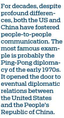 For decades, despite profound differences, both the US and China have fostered people-to-people communication. The most famous example is probably the Ping-Pong diplomacy of the early 1970s. It opened the door to eventual diplomatic relations between the United States and the People's Republic of China. The "diplomats" were nine US table tennis players, one of whom missed the team bus at the 1971 World Table Tennis Championship in Japan, traveling instead with the Chinese national team. An invitation to visit China for a series of "friendship" matches soon followed. This at a time when the US and China rarely communicated, and if they did, they talked "at "each other not "with." Table tennis provided a form of back-channel communication, away from the media spotlight.