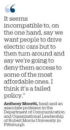 "It seems incompatible to, on the one hand, say we want people to drive electric cars but to then turn around and say we're going to deny them access to some of the most affordable ones. I think it's a failed policy," Moretti added.