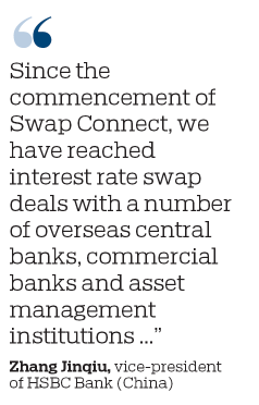 "Since the commencement of Swap Connect, we have reached interest rate swap deals with a number of overseas central banks, commercial banks and asset management institutions, involving a variety of floating benchmark interest rates and terms, thereby helping foreign investors effectively hedge against interest rate risks," said Zhang Jinqiu, vice-president of HSBC Bank (China).