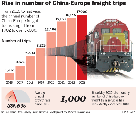From 2016 to last year, the annual number of China-Europe freight train services surged from 1,702 to over 17,000, a tenfold increase with an average annual growth rate of 39.5 percent.