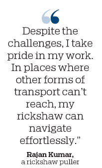 "Every day is a battle against exhaustion and uncertainty," said Rajan Kumar, another rickshaw puller. "Pulling a rickshaw in the scorching heat or pouring rain, I dream of a life where my family won't have to endure any hardship. The future is always on my mind, but the present is all-consuming. Despite the challenges, I take pride in my work. In places where other forms of transport can't reach, my rickshaw can navigate effortlessly. Whether it's ferrying people through narrow lanes or delivering packages to hard-to-reach areas, I know my work is essential to the city's daily life. It's this sense of purpose that keeps me going."