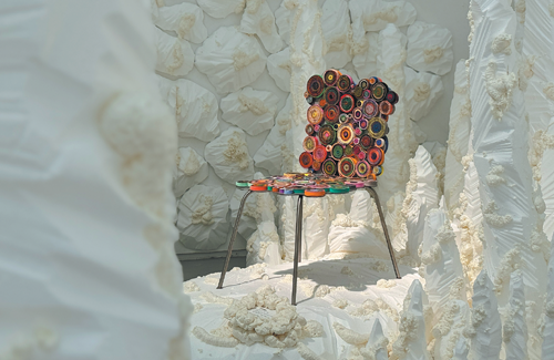 To provide a nest for the curators' vision, Humberto Campana has designed an alluring structure of artificial stalactites and stalagmites, a reference to Plato's "Allegory of the Cave", where visitors can roam freely and discover the pieces as they materialize from behind organically shaped columns, like a game of hide-and-seek.