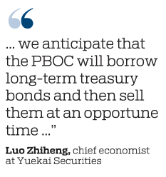 Luo Zhiheng, chief economist at Yuekai Securities, said borrowing securities will help the central bank quickly acquire long-term treasury bond holdings — they are likely limited in size right now — so that it can sell them in the secondary market, driving down bond prices and pushing up bond yields.