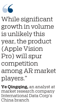 China's augmented reality industry is expected to usher in a new stage of growth, as Vision Pro's official release in China is expected to encourage more local software developers to come up with more innovative applications for it, said Zhao Siquan, a senior analyst at market research company International Data Corp's China branch.