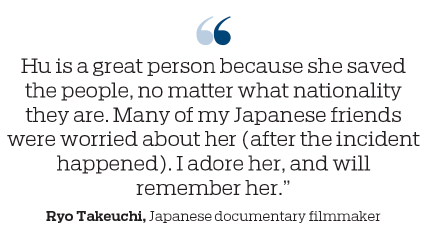Ryo Takeuchi, a documentary filmmaker from Japan living in Nanjing, Jiangsu, also posted a statement on Weibo on June 28 to mourn Hu. "Hu is a great person because she saved the people, no matter what nationality they are. Many of my Japanese friends were worried about her (after the incident happened)," he wrote. "I adore her, and will remember her."