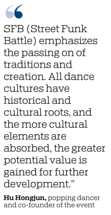 Popping dancer and SFB co-founder Hu Hongjun and his team are the organizers behind SFB, while Popin Pete, one of the founding members of the Electric Boogaloos, is a co-founder of the event, which includes a training camp, competitions and lectures.