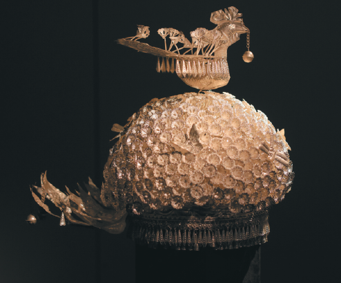 The silver blossom hat on display is decorated with low tassels at the forehead and a lifelike silver sparrow. When the wearer moves, the silver sparrow will tremble slightly, and the tassels sway gently, giving the hat a sense of vitality. About 30 steps were involved in its creation, four of which — wire drawing, wire braiding, carving, and wire coiling — were the most important, according to the exhibition organizers. "The hat is an ordinary person's tribute to life," Su says.