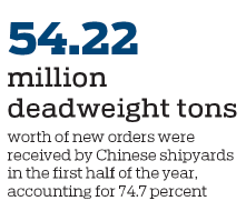 Among the world's 18 major ship types, such as bulk ships and oil tankers, China ranked first globally in new orders for 14 of them during the January-June period, statistics from the Beijing-based China Association of the National Shipbuilding Industry showed.