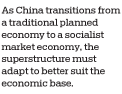 As China transitions from a traditional planned economy to a socialist market economy, the superstructure must adapt to better suit the economic base. This means ensuring government actions help meet the demands of an efficient socialist market economy.