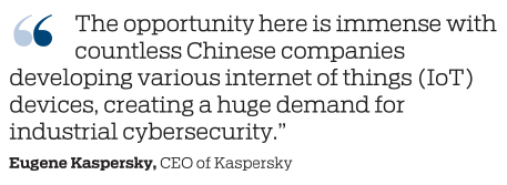 "China is a global manufacturing hub. The opportunity here is immense with countless Chinese companies developing various internet of things (IoT) devices, creating a huge demand for industrial cybersecurity," said Eugene Kaspersky, CEO of Kaspersky, which operates in about 200 countries and regions.