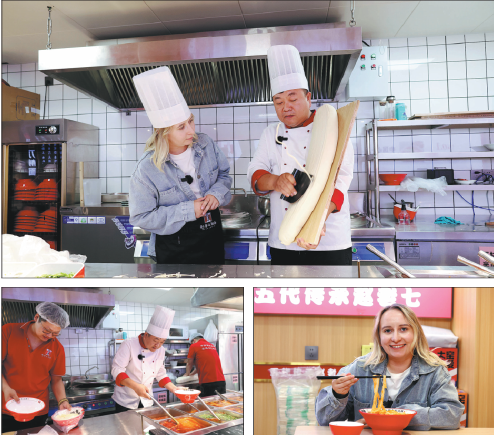 Zhao Xiping and members of his team are busy working in the kitchen. With each slice, as thin as a silverfish, gracefully arcing through the air before landing in the boiling water, Zhao's hands paint a mesmerizing picture of culinary artistry. The rhythmic movements of the knife against the dough, the little splashes of the noodles hitting the hot water and the tantalizing aroma of the food filling the air create an immersive experience for customers.