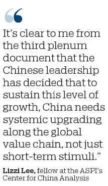 "It's clear to me from the third plenum document that the Chinese leadership has decided that to sustain this level of growth, China needs systemic upgrading along the global value chain, not just short-term stimuli," Lee said.