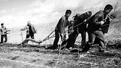 Farmers pull plows to open up wasteland for farming in Qiqihar, Heilongjiang province, in the 1960s. XINHUA