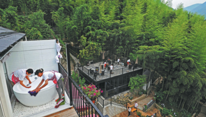 Villagers clean a guest room at a homestay in Anji county, Zhejiang province, in June 2018. TAN JIN/XINHUA