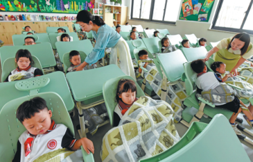 A teacher helps first-grade students use reclining chairs during lunch break at the Xianju School, affiliated to East China Normal University, in Shanghai, on Sept 2, 2024. WANG HUABIN/FOR CHINA DAILY