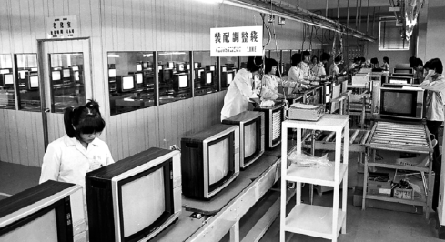 Workers at the color television production line of Shenzhen Huali Electronics Co Ltd in 1986. LI CHANGYONG/XINHUA
