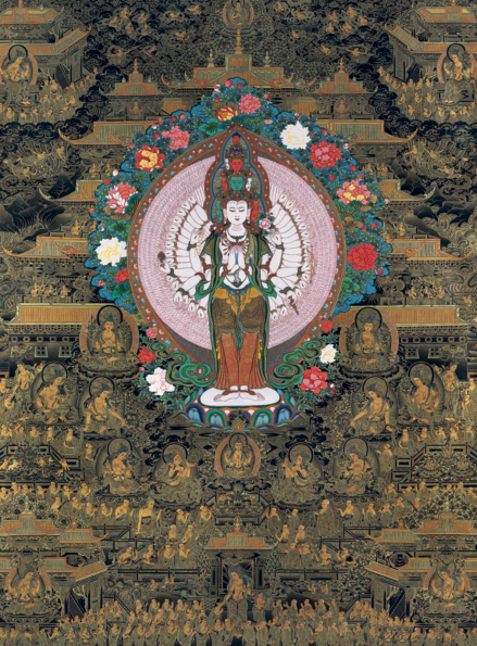 Thangka is a traditional style of Tibetan painting on silk or cotton, usually depicting a Buddhist deity, scene, or mandala. They are religious paintings usually with a bamboo-cane rod pasted on the bottom edge by which it can be rolled up.