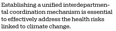 Establishing a unified interdepartmental coordination mechanism is essential to effectively address the health risks linked to climate change. By pooling resources, data, and funding across sectors, this mechanism can streamline efforts and enhance collaboration, allowing for a more robust response to climate-related health challenges.