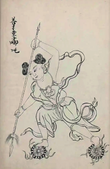 In Buddhist works, Nezha often appears together with his father, carrying a magical miniature pagoda. His duty is to help him guard the Dharma, ward off evil spirits, and protect people.