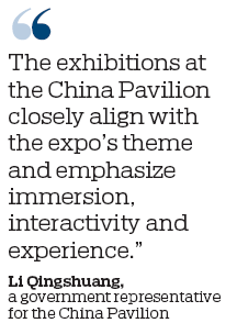 Li Qingshuang, deputy head of the China Council for the Promotion of International Trade and government representative for the China Pavilion, said: "The exhibitions at the China Pavilion closely align with the expo's theme and emphasize immersion, interactivity and experience. The presentation methods are diverse, blending tradition and modernity, and rich in cultural sentiment."