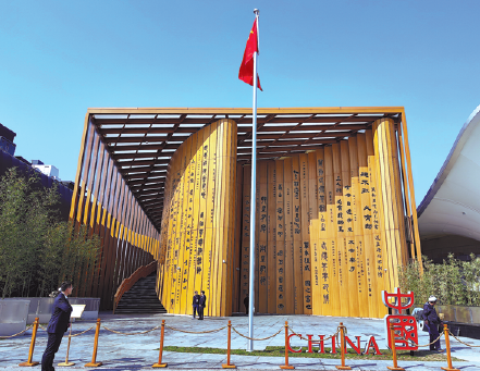 According to Liu Shuo, deputy director of the China Pavilion, its design was inspired by traditional bamboo slips, incorporating cultural elements such as bamboo and Chinese characters.