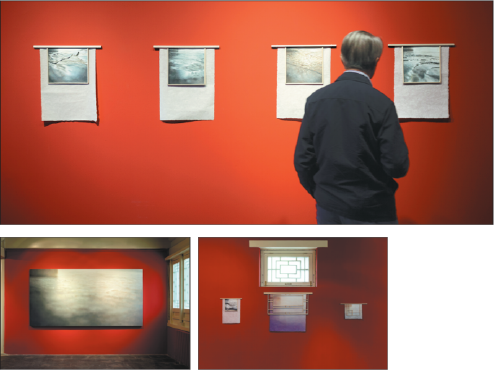 Fourteen paintings from her Window of the Square Courtyard series are on display. All but the first are overlaid with wooden lattice frames.