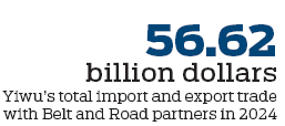 In 2024, Yiwu's total import and export trade with Belt and Road partners reached 413.34 billion yuan ($56.62 billion), up 18.2 percent year-on-year, accounting for 61.8 percent of the city's total trade, and making it a key growth driver, official data shows.